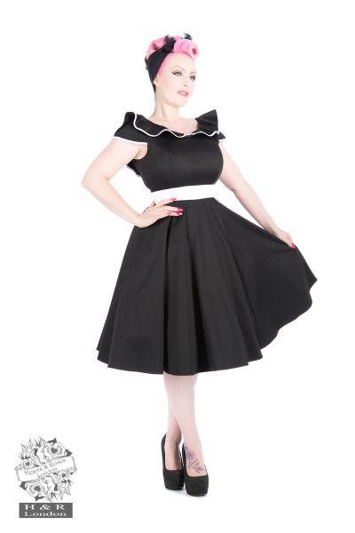 The 50s Black Flute Collar Dress from H&R London is a beautiful black swing dress with a distinctive fluted ruffle collar on the yoke. Dress is made out of a soft, stretchy cotton and has cap sleeves, and full swing skirt. White band on waistline and white piping on sleeves and collar make this not just an ordinary black dress! Dress has a slight scoop neck to show off decollate and flattering cap sleeves. Dress hits just below the knee, and zips up the side for a comfortable fit.