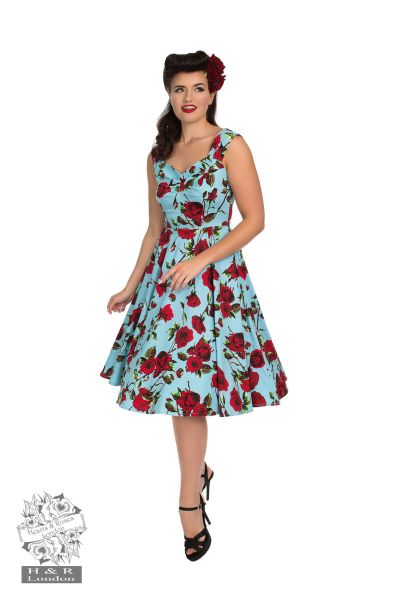 Beautiful floral spring/summer dress with a vibrant mix of red and mauve Roses with a touch green leaves against a baby blue background. This dress is a modern take on a classic style with a fresh print and sweetheart neckline with ruched over the bust detail and will be a key piece of your spring/summer wardrobe.