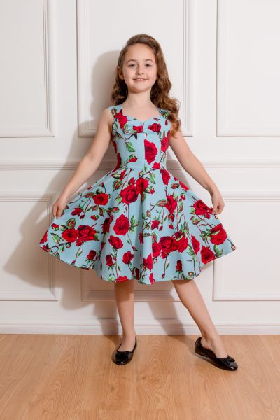 Girls 50s Ditsy Rose Floral Summer Dress in blue: