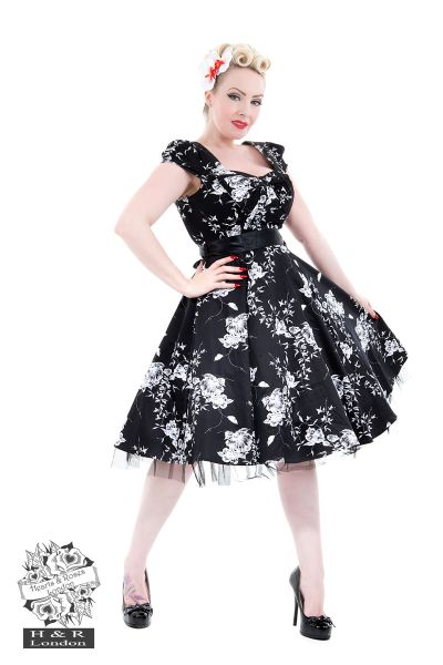 Vintage vixens, follow your pinup style to H&R London's 50’s Imitation Black white floral Tea Dress! A best-selling print in a flattering cut, the 50’s Imitation Black white floral tea Dress is beautifully made out of a soft, stretchy cotton, with elasticized cap sleeves and a sweetheart neckline. A cute bow sits atop the bust line for a charming touch, and the dress has a full swing skirt with a built-in cotton lined black petticoat. A black satin sash ties the look together for that hourglass figure!  Dress hits at the knee, and zips up the side.
