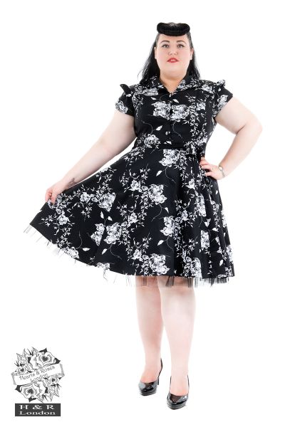 Minnie just can't be beat!    H&R London's Imitation Floral Tea Dress is such a classic look for any pinup, you'll have them blinking their eyes in a time-warp haze! The Imitation Floral Tea Dress has a beautiful and classic Imitation Floral print set on a stretchy cotton in a shirtdress style silhouette. Dress has short, elasticized sleeves, a shirt collar, and a row of black buttons going down the front.   Dress has a matching floral belt that ties at the back, and a built-in cotton lined black petticoat for that extra dose of vintage charm.