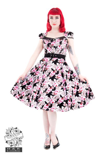 Add a touch of vintage this season, with our pink floral swing dress. The design consists of a vibrant print of floral, set on a black stretchy cotton fabric. The black and pink floral really complements the style. The bodice is fitted to give you a much emphasis on the waist and swing skirt, while the bodice also features a black tie belt to insinuate the waist.  We finished this style off with a flap over sweetheart neckline and capped sleeves for those lovely shoulders. Come on ladies, it sure is an eye-catching design to add to your own collection of vintage treats.