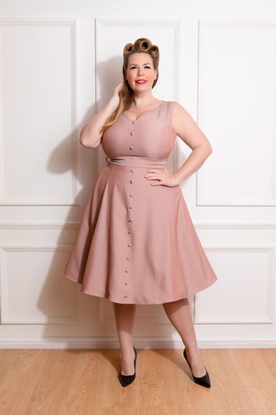 Step into summer in style with our Alison Swing Dress! This brand new summer style is perfect for your next big event! The fabric is chic and sophisticated in its look and feel, detailing a beautiful chevron weave. The subtle pink tone of the dress catches the light beautifully, making it a stellar summer piece. Featuring a v neckline, leading to delicate front buttons, this dress is great for a summer soiree. The tie belt adds that feminine touch as it cinches in the waist and finishes in a beautiful bow, which can be placed either at the front or back of the dress. We also incorporated the very practical hidden side pockets for your ease!