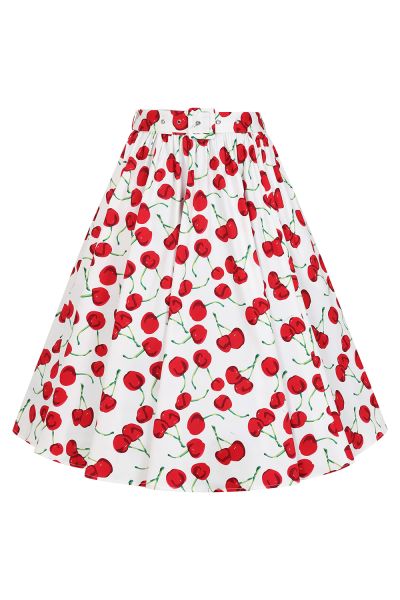 Our brand new Amelie Cherry Swing Skirt is a delightful addition to any vintage-inspired wardrobe. Crafted from a soft cotton blend with slight stretch, this charming skirt features an all-over cherry print with vibrant red cherries and lush green stems set against a crisp white base. Designed with both style and functionality in mind, the skirt boasts a flattering waistband, a matching belt with a buckle and silver eyelets, and convenient belt loops for a polished finish. Practical hidden side seam pockets add versatility, while the gathered waist and hidden side zip ensure a tailored, comfortable fit. Perfect for adding a playful touch to your look, the Amelie Cherry Swing Skirt is as sweet as it is stylish.