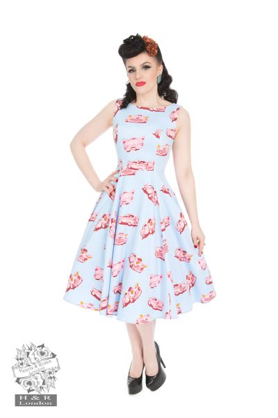 Set your hearts racing with our beautiful car hop print dress, which is also available in a sweetheart neckline design (9836 Car hop Swing Dress). Following our world famous Audrey’s 50s Cream Floral Swing Dress (9347), this dress will surely sell as fast as an F1 car. The Audrey’s design features a simple, yet elegant high boat neckline. She is fabricated on a sky blue soft stretchy cotton blend fabric while featuring an amazing pink Cadillac car print throughout this gorgeous design. Why don’t you jump in and try it out?