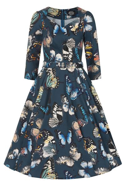 Make a statement with our new Bambi Butterfly Swing Dress. This enchanting butterfly print on a deep blue base, stands out from the crowd with its romantic fluttering motif. This style features a flattering sweetheart neckline to suit all and give that 50’s retro charm. The gathered ¾ length sleeves are accentuated with a charming sleeve cuff detail, complete with a keyhole and button closure. A self-fabric belt with a buckle, accompanied by belt loops, cinches the waist for a beautifully tailored look. Practicality meets style with concealed side seam pockets, while a concealed back zip ensures a smooth, seamless fit. Perfect for any occasion, this dress effortlessly combines classic elegance with a playful twist.