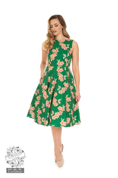Our new Beth Swing Dress is made for Sunday strolls in the park or picnics in the sun. Not to be hidden away, this style is a gorgeous green shade sporting orange and cream florals which are scattered lovingly all over the swing style. Summers are for ease, which is why we have added our classic hidden side seam pockets to hold your possessions and a concealed back zip so you don’t have to mess up your amazing hair style! Designed with the true 50’s stars in mind, we have given this style a classic boat neckline as a nod to Audrey herself. Pair with flats or heels and simple accessories to take this style out for a spin!