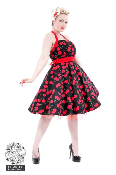 Ready for summer are we? Enhance your everyday summer look in our Black Bombshell Cherry Swing Dress. Our striking black cotton rockabilly dress, featuring a printed design of cherries on a black background is a summer style that will have compliments coming your way. With a sweetheart bust line & a halter neck tie, we added a contrasting red cotton belt which nips in at the waist to give the dress a vibrant look. Fully lined skirt in soft cotton with a red netted trim, giving you plenty of room to add a petticoat if needed.