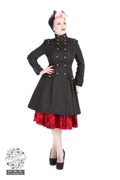 H&R London's newest coat is the Black Brocade Trench Coat.  Crafted out of a soft black Brocade fabric, the Coat features a funnel neckline with double breasted buttons going down the front.  Epaulets on the shoulders and the flared hem adds to that vintage look.  Embossed silver tone buttons on the cuffs and pockets.
