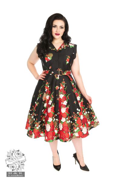 Timeless fashion and a true winner with our new vintage swing dress. We present to you a one of a kind design, with a twist of 50’s vintage, and a modern day style. This collared shirtwaist dress with front buttoned closure is truly an everyday dress which is also perfect as an evening wear piece. With its beautiful red floral border print, enhanced by its black background and belt at waist, this dress will give you that accentuated waistline you always wanted. It sure is a multipurpose dress for anyone looking for a versatile design.
