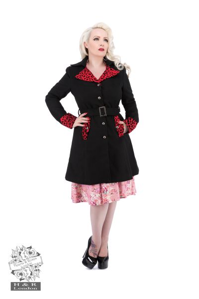 Look your most feline-ly feminine in H&R London's brand new Coat. A single breasted coat made out of a soft poly wool, the Coat features a black raised felt leopard print design on the lapels and cuffs.  Coat has 4 embossed silver tone buttons that open and close, along with a detachable belt with silver buckle, holding you  all in comfortably.      Coat has two side slash pockets with decorative buttons.   Coat hits mid-thigh.    Available in Black with Black Trim, and Black with Red Trim.