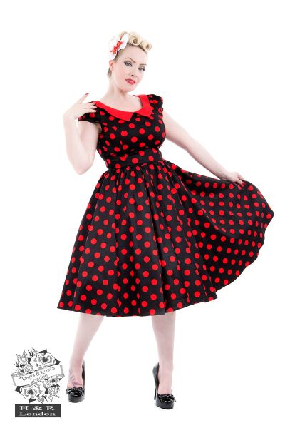 Feeling that vintage vibe, but don't know what to wear? Try the Black Red Large Polka Dot Swing Dress from H&R London!  The quintessential retro-style dress in polka dot, the Black Red Large Polka Dot Swing Dress says all the right things.   A cute cap sleeve swing dress made out of soft, stretchy cotton, the Black Red Large Polka Dot Swing Dress features a large polka dot pattern on a black background with a pointed collar.   Dress has a full swing skirt, gathered at the waist.