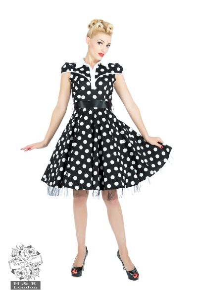 H&R Black White Big Dot Long Dress is a style complementing the 50’s retro vintage era. The design consists of large white polka dots printed all over on a black stretchy cotton fabric. The style has a fitted bodice, flaunting a Peter Pan collar neckline with decorative white buttons going down the front. The bodice features a black satin tie belt which can be removed and capped sleeves for a comfortable fitting around the arms. To add to this style we added a black cotton underskirt with a black netted trim to give this style a full swing.