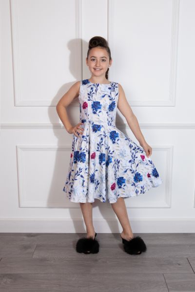 Pretty, twirly, and full of charm, the Blue Blossom Swing Dress brings a fresh floral touch to every little one’s wardrobe. The soft ivory base is scattered with beautiful blue and berry-toned blossoms, creating a delicate garden-inspired look perfect for special occasions or sunny day outings. The sleeveless bodice offers a comfortable, easy fit, while the full swing skirt invites endless spinning and playful movement. Lightweight and breathable, this dress keeps little ones cool and comfortable while looking adorably polished. Ideal for family gatherings, parties, or picture-perfect moments, the Blue Blossom Swing Dress is a sweet blend of elegance and fun.