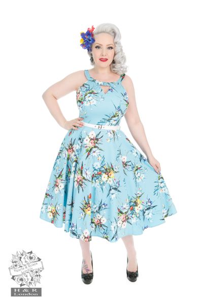The new Blue Lizzy Floral Dress will be perfect to flaunt when the suns out. This summer perfect dress features a round halter neck that allows that summer breeze to keep you cool and collected during the warm summers. It has a cute v-cut out design just below the neckline to give you that extra hmmphh about your look.  The fabric consists of an array of summer delphinium flowers in blue, orange and cream with palm on a stunning sky blue background. It has been composed by a light stretchy cotton fabric and she comes with a white slim belt to give you a lovely fit. Whether it is day or night, The Blue Lizzy Floral Dress would be perfect for the occasion.