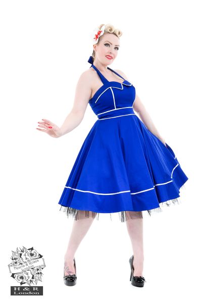 Make a statement in H&R's Sailor Moon Halter Neck Dress!  Our dress is made from beautiful Blue fabric with White piping trim.  Halter straps tie in the back and there is black crinoline peeking out from the hemline.