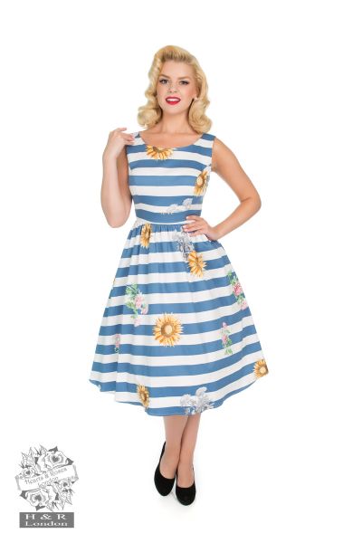 The combination of white and blue stripes set the scene for the kind of summer you will always remember. The dress features skyscraper sunflowers and pink cornflowers with a high boat neckline, delicate pleats circling the waist for the perfect frill skirt. A soft, stretchy cotton fabric makes this beauty perfect for the hot summer days or the evening parties.