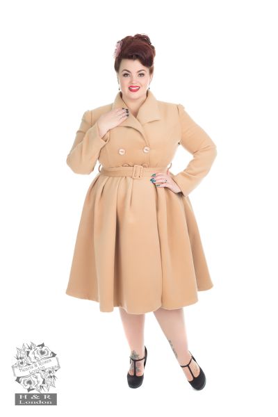 Classic 1950’s swing coat made in heavyweight fabric with fully inner lined which makes it luxurious and keeps you warm. A double breasted style coat, fitted top and pleated swing skirt with a belt for that extra look. It will be a key piece of your wardrobe through many seasons. The coat has side pockets to escape the chilly weather.