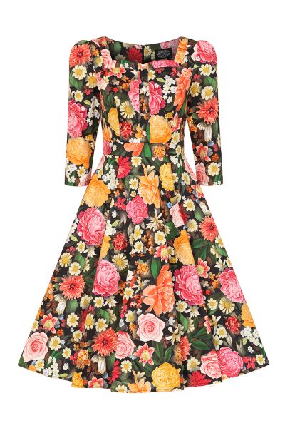 Introducing our brand new Cassidy Floral Swing Dress. This style embraces the vibrant charm of winter with this beautifully blooming floral print which is placed over the entire style. Featuring a classic sweetheart neckline and delightful front buttons, this dress exudes timeless elegance. The gathered ¾ length sleeves and defined waistband enhance the feminine silhouette, while concealed side seam pockets add a practical touch. The concealed back zip ensures a seamless, polished finish. Perfect for brightening up those colder days, this dress combines style, comfort, and functionality effortlessly. This style helps to bring the magic of spring florals right through your winter season.