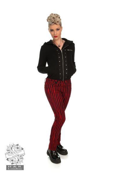 Look and feel sassy in our Cassie style! Add this alternative piece to your wardrobe this summer, with our newly styled cotton blend trouser. The design has an all over bold vertical red and black stripe print, which will make you stand out from the crowd. Striped trousers are a great piece to add to your alternative wardrobe. We created a slim fit trouser with added statement & style, making Cassie a true alternative gem.