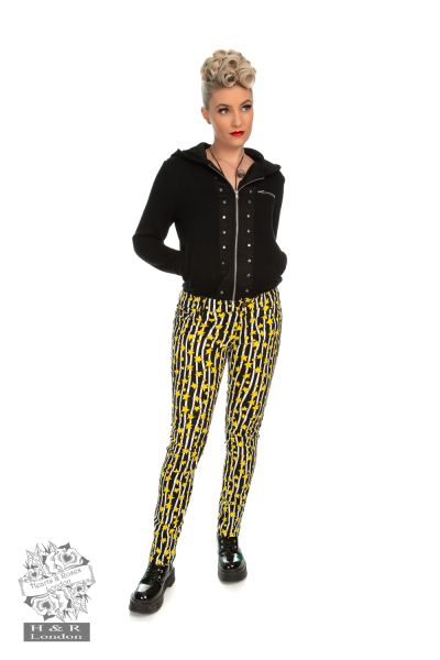 Look and feel sassy in our Cassie style! Add this alternative piece to your wardrobe this summer, with our newly styled cotton blend trouser. The design has an all over bold vertical black and white stripe print with an eye-catching array of yellow stars, which will make you feel like a superstar and stand out from the crowd. Striped trousers are a great piece to add to your alternative wardrobe. We created a slim fit trouser with added statement & style, making Cassie a true alternative gem.