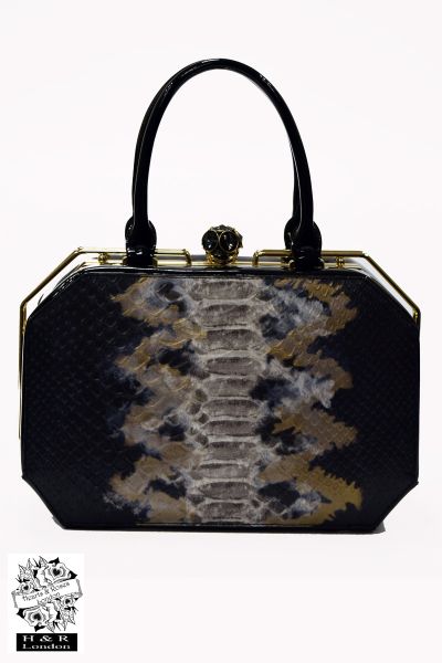 This snake print bag has a holographic finish and octagonal shape features a metal-look frame and push clasp fastening with all gold toned hardware. The neutral nature of this bag would make it quite a versatile accessory. It is finished in luxurious faux leather and has a practical internal zip compartment for all your essentials.