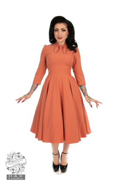 Frosty nights create warm memories, and Hearts & Roses create vintage memories. We present our charming blush swing dress. Made of a supple blush pink fabric with a light stretch for a perfect fit. Our new blush swing features a simple fitted bodice with a stand collar neckline, detailed with a decorative neck tie & button. To finish off our blush design, we have an elegant tie belt and a flowy swing skirt. Your wardrobe will be incomplete without this stunner, a divine vintage beauty.