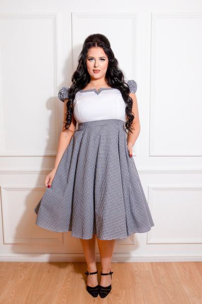 Check out our brand new Chelsea Check Swing Dress! Designed with an incredibly sweet black and white gingham print, balanced out with a white bodice, this style will be your go to this summer. The easy to wear shape makes this dress good for all occasions, dressed up or down by adding your favourite accessories or glam shoes to finish off the look. The square neckline with front notch is a really flattering shape, alongside the cap sleeves and full swing skirt. We haven’t forgotten the super handy hidden side pockets to hold all your treasures!