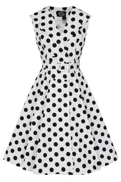Timeless, polished, and full of retro charm, The Clarissa Polka Dot Swing Dress brings classic monochrome elegance to one of our most beloved silhouettes. Designed in crisp white with bold black polka dots, this dress blends playful femininity with refined 1950s tailoring. The structured collar and button-front bodice enhance its vintage-inspired sophistication, while the fitted waist and coordinating belt create a flattering, hourglass effect. Falling into a beautifully full swing skirt, Clarissa offers graceful movement and a silhouette that never goes out of style. Versatile enough for daytime outings yet chic enough for evening events, The Clarissa Polka Dot Swing Dress is a timeless wardrobe favourite for lovers of true vintage elegance.