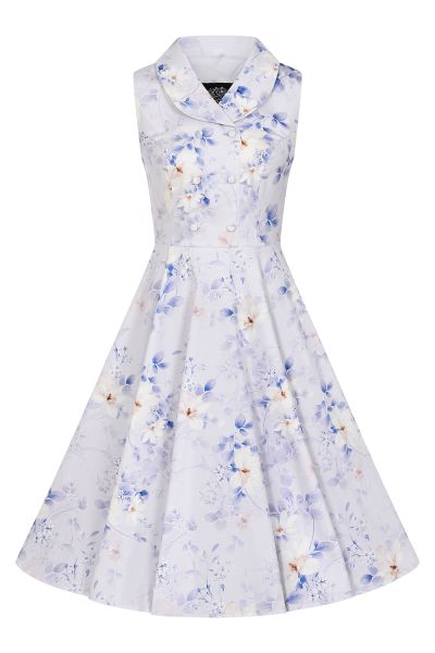 Indulge in the timeless allure of 1950s with our Cynthia Floral Swing Dress. Embrace the classic elegance and charming nostalgia of our favourite era with this beautiful design led swing dress. This style features a flattering rounded lapel collar above a double-breasted button detail on a fitted bodice with stretch, offering comfort and style in one. Crafted from a high-quality cotton blend stretch fabric, this dress boasts a delightful array of retro-inspired floral motifs. The lively blue and cream blossoms on a soft purple base, reminiscent of a vintage garden, infuse a sense of whimsy and grace into your attire. The mid-length hemline and modest yet alluring neckline make it suitable for various occasions, whether it's a casual daytime outing or a delightful evening soirée. This dress is ready to wear to your next event, just grab your favourite pair of flats or heels and you’re ready to go!
