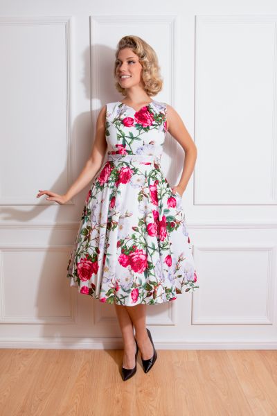 Designed with high elegance in mind, our new Debbie Floral Swing Dress is perfect for an evening out in the city or a picnic in the park. This versatile piece exudes style with its strong floral motif lying on the crisp white base, perfect for catching the eye of the beholder. The classic V neckline is incredibly elegant and sits neatly on the neckline with front pleats. The waistband cinches in the waist, accentuating the full flowing skirt, making this a 1950’s dream silhouette. Pair this style with flats or heels to complete the look.