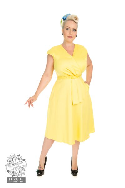 Celebrating the summer sunshine, we have added a bright new number to our collection. The Elaine Summer Dress is a must have for those hot sunny days. Made using our classic stretchy cotton in a fabulous bright yellow shade. This retro style is eye-catching with its cap sleeves, wrap front with single button closure and sleek gathering at waist. We added a beautiful pleated panel which drapes from the waist to add some retro flare, tied in with a thin self-coloured belt with buckle closure.