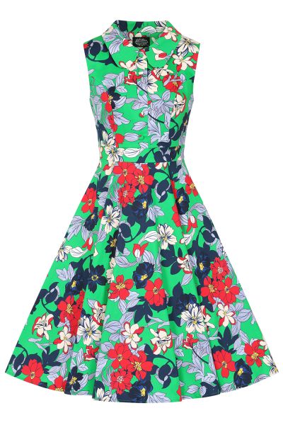 Step into bold vintage beauty with our Emerald Botanica Swing Dress, a vibrant celebration of colour and classic femininity. Designed with a rich emerald-green base adorned with blooming florals in shades of ivory, lilac, and ruby, this dress captures the effortless charm that defines Hearts & Roses London. The sleeveless fitted bodice features a collar at the neckline, front buttons and delicate tailoring that enhances the natural silhouette. The waist is gently cinched, leading into a full, flowing swing skirt that brings movement and grace to every step. Whether you're twirling through a garden party or brightening a daytime outing, the Emerald Botanica Swing Dress blends statement colour with timeless vintage appeal. Crafted from comfortable, breathable fabric, this dress is perfect for those who love floral prints with a dramatic twist.