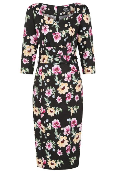 Our new Emily Floral Wiggle Dress is a perfect fit for any vintage wardrobe. Its luscious pink, yellow and green shade florals balance perfectly with the black base placed across the entire style. The sweetheart neckline stays true to our vintage hearts while the gathered bust adds that extra feminine flare. The wide waistband is super flattering and is accentuated by the buckled belt which sits neatly at the waist. This figure hugging style is full of retro charm and is sure to catch the eye with its stand out floral print, just add your favourite accessories and you’re all set to go!