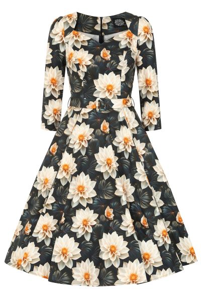 Forever inspired by the style of the 1950s, this stand out Farah Floral Swing Dress is beautiful with its bright white florals scattered all over the swing shape dress on a bed of dark and eye-catching green leaves. The sweetheart neckline gives that feminine flare while being flattering and easy to wear. The ¾ length gathered sleeves have a beautiful sleeve cuff detail which features a keyhole with a single button closure. The flowing swing skirt is great for dancing all night long, spinning and twirling the night away. We have also added our signature hidden side seam pockets for your added ease. The self-fabric belt with buckle cinches in the waist to let the 50s swing skirt move gracefully. Great for day or night, this style is perfect for your next event.