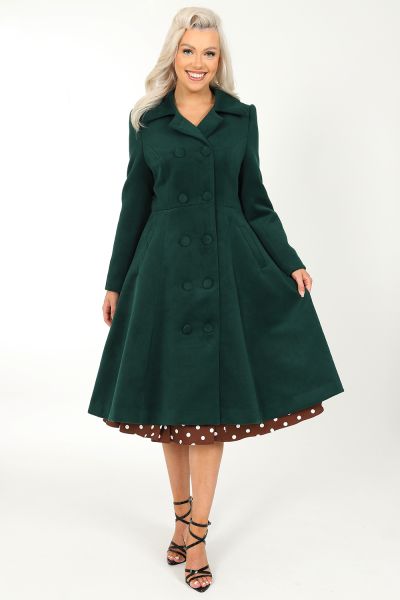Introducing our brand new Forest Swing Coat. Classic and sophisticated in its style, this coat is beautifully made with its soft and comfortable fabric. The lapel collar gives it an overall structured look, balancing perfectly in harmony with the front double breasted buttons. The full length sleeves will keep you warm this season, as will the front side welt pockets which are comfortable for your hands or treasured items. The swing skirt design allows for a full petticoat to be worn underneath, keeping that forever loved vintage style in mind. Pair this style with a stand out bag or wear as is. Either way this coat is ready for your next outing this season!