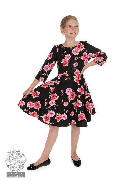 Our new Ava Floral Swing Dress is a bright vintage number! The vivid pink rose is an eye-catching print! We have added a beautiful notch at the front of the neckline to add detail to our classic boat neckline. The ¾ length sleeves are practical. And we have added that extra cute factor through the gathering, decorative buttons and slit on the sleeves! Perfect for your vintage loving girls.