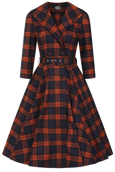 Our new Giselle Tartan Swing Dress is a delightful blend of retro charm and modern functionality, crafted from a soft cotton blend for comfort and ease. This dress features a rich rust and blue tartan fabric, blending warm earth tones with cool hues for a striking, balanced contrast. The classic plaid pattern adds timeless charm, while the bold colour pairing brings a fresh, modern twist to traditional tartan. Its stylish lapel collar and ¾ length sleeve design adds a touch of sophistication, while the functional double-breasted front buttons offer an added style aspect. The dress is thoughtfully designed with belt loops and a matching belt complete with a buckle and silver eyelets, allowing you to cinch the waist for a flattering fit. Hidden side seam pockets provide a practical touch, perfect for keeping small essentials close. Whether dressing up or down, the Giselle Tartan Swing Dress is a timeless piece that effortlessly blends elegance and practicality.