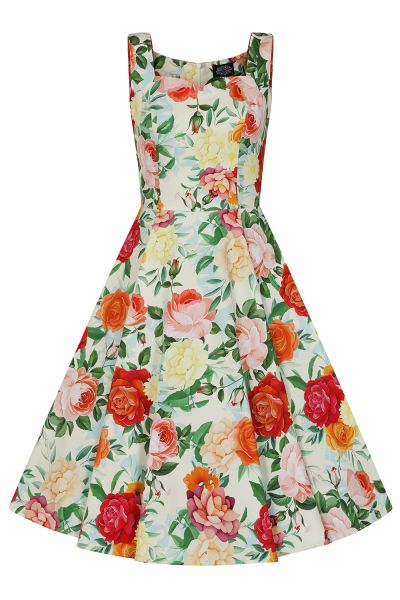 Bright, elegant, and beautifully romantic, the Golden Peony Swing Dress is a celebration of vintage florals in their most charming form. Set on a soft, buttery ivory backdrop, the dress blossoms with painterly peonies in warm shades of golden yellow, peach, rose pink, and soft coral. The result is a sunlit garden come to life, timeless, feminine, and unmistakably Hearts & Roses London. The sleeveless bodice features a graceful V-neckline framed by wide, supportive straps that flatter the shoulders and create a classic silhouette. Tailored panelling sculpts the waist before the dress flows into a full, sweeping swing skirt, offering effortless movement and that iconic 1950s-inspired shape. Crafted from soft yet structured fabric, the Golden Peony Swing Dress blends comfort with elegance, making it perfect for weddings, garden parties, and any moment that calls for floral romance.