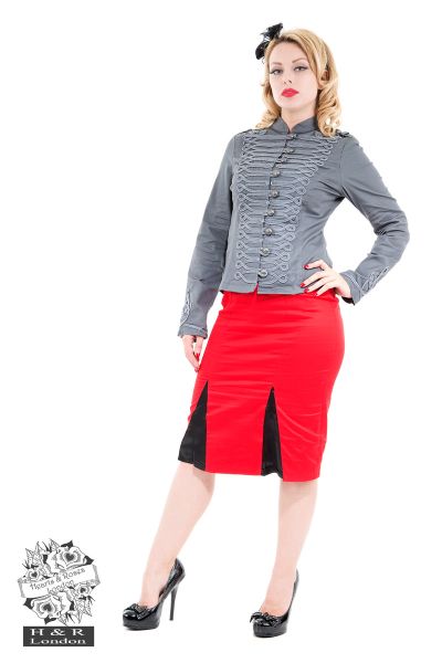A Perfect military style jacket with rope braiding to the front and end of sleeves and epaulettes. The jacket is made from soft stretchy cotton with ornate Victorian button detail down the front of jacket that fasten it.