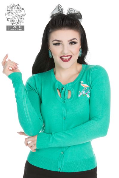Jean cardigan is a pretty piece of knitwear at hearts & roses London with flamingo embroidered. She has long sleeves, a ‘crew neckline with a cut-out and tie. Embroidery flamingo with tiny floral makes it so adorns and helps to match up with any dress. Fastens with 5 classic buttons along the front.
