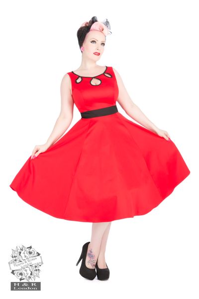 Unlock your sensuality with the key to retro-inspired date nights!    H&R London's Keyhole dress is just the dress for romantic evenings.    A sleeveless swing dress with three cute cutouts at the neckline, the Keyhole dress has white or black piping on the cutouts and collar, showing just a peek of cleavage.   Dress has a contrasting banded waistline and is made out of a soft, stretchy cotton.   Dress hits below the knee, and zips up the side.  Available in Black and Red.