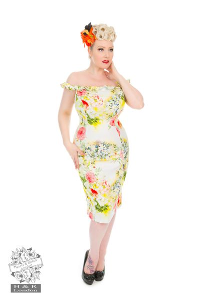 This beauty is perfect for a day out as well as on a special occasion. You can also dress this style up, to turn it into a summer formal wear piece. The fabric features a mix of bright and beautiful florals in pink, yellow, red and green, taking you back to the good old days strolling on a patch of grass by the beach whilst the sun is shining on you. She consists of an off shoulder style with ruffles to give our H&R lovers a stylish and sophisticated look. Kyra will surely add elegance to your wardrobe, so stock her to bring feminism with a little sass to your collection of vintage attire.