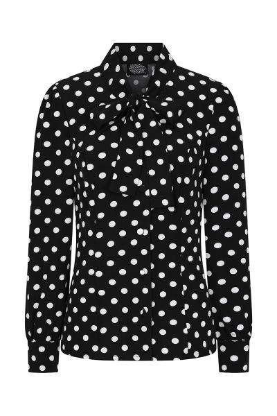 Add a touch of classic elegance to your wardrobe with our black and white Laila Polka Dot blouse. This sophisticated piece features a charming pussybow neckline, adding a feminine and vintage-inspired flair. The front buttons offer both style and functionality, making it easy to wear while giving a chic shape to the piece. The gathered full-length sleeves provide a graceful silhouette, while the gathered sleeve cuffs with button closures add a refined finish. Perfect for both professional and casual settings, this blouse is a versatile addition to any wardrobe with a vintage flair. This style works wonders with our wiggle skirts for a go to office look.