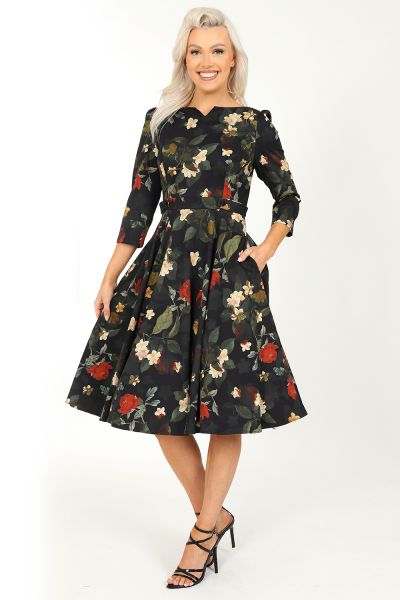 Our stunning new winter swing, the Leia Floral Swing Dress, has just arrived and we are so excited to share it with you. This gorgeous dress is made up of our classic stretchy cotton which is soft and comfortable to wear. The print is perfect for a winter’s walk or a coffee out in the town, with its muted red and yellow petals, beside soft green leaves, all on an anchoring dark black base. This print speaks for itself with its subtle beauty. The style itself is simple, letting the print work in harmony with it. The boat neckline with front notch works with the detailed waistband and flowing skirt. This style can be worn alone, just add shoes and you’re all set!