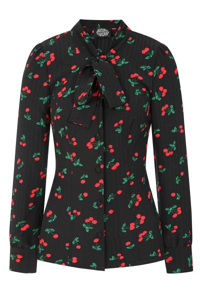 Add a touch of classic elegance to your wardrobe with our Lena Cherry Blouse. This sophisticated piece features a charming pussybow neckline, adding a feminine and vintage-inspired flair. The front buttons offer both style and functionality, making it easy to wear while giving a chic shape to the piece. The gathered full-length sleeves provide a graceful silhouette, while the gathered sleeve cuffs with button closures add a refined finish. Perfect for both professional and casual settings, this blouse is a versatile addition to any wardrobe with a vintage flair. This style works wonders with our wiggle skirts for a go to office look.