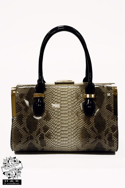 Hearts & Roses London’s Leonie handheld bag is crafted in python effect print with clip fastening and a detachable shoulder strap. This versatile bag is finished in luxurious gloss PU leather and has a practical internal zip compartment for all your essentials. Carrying Leonie will always be for a dash of relaxed elegance.