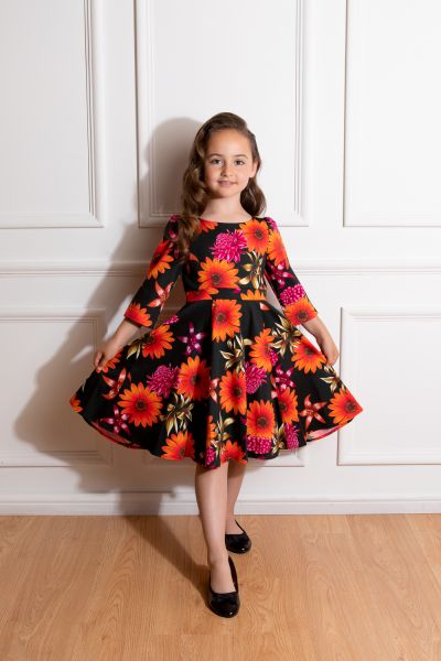 Bold and bright, our new Madison Floral Swing Dress is a must have this season with its stand out floral print which carries the sun all through the winter months! The large scale floral print stands out of the crowd with its beautiful orange, purple and beige tones. While the simple shape of this piece allows the print to speak for itself. Made with our classic stretchy cotton to allow non-stop playing, this style is perfect for all events. Just add your favourite shoes and you’re all set!
