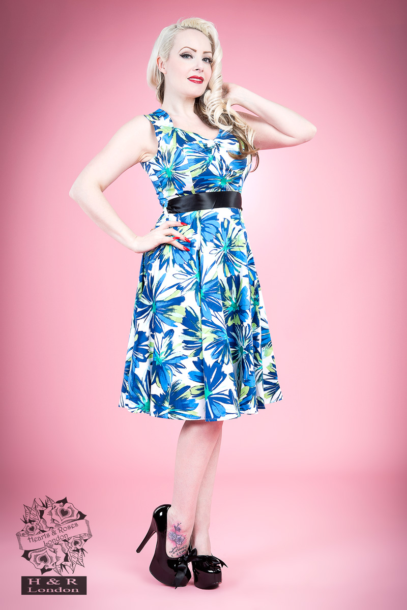 H&R Mandarin Tunic Hepburn Dress features a beautiful tropical design of royal blue flowers with a hint of light green shades. This style is a style to wear in the summer, while you can dress it up to wear at any special occasion, with one of our petticoats, or bolero’s.