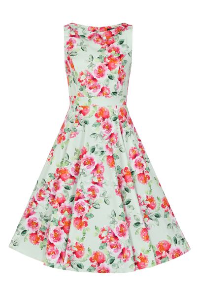 Embrace the timeless allure of our Marissa Floral Swing Dress, a vintage-inspired brand new style that effortlessly combines classic charm with a modern twist. This enchanting dress features a captivating print adorned with red, pink and orange florals and lush green leaves on a mint green base, reminiscent of a classic 50s style which we all know and love. The boat neckline takes on a unique flair with a flat collar detail, accentuated by decorative buttons that add a touch of refinement to the piece. This subtle feature frames your neckline with grace, creating a perfect blend of classic and contemporary design elements. The waistband gently cinches at the waist, creating a figure-flattering silhouette that pays homage to the feminine styles of the past. It's a nod to the timeless grace and poise that vintage fashion is renowned for, ensuring you radiate elegance at every turn. The swing skirt completes the ensemble with a playful and twirl-worthy flair, capturing the joyful spirit of retro aesthetics. With every step, the skirt moves with grace and charm, making this dress perfect for a variety of occasions.